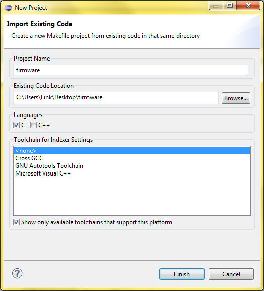 - Click en File, New, Makefile Project with Existing Code